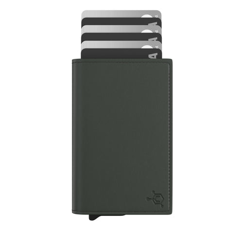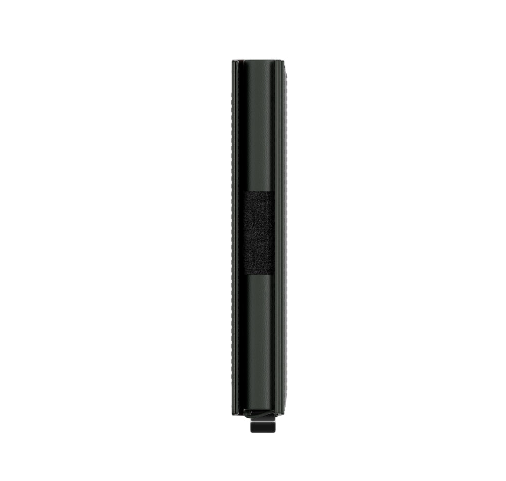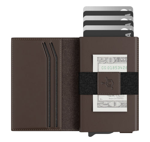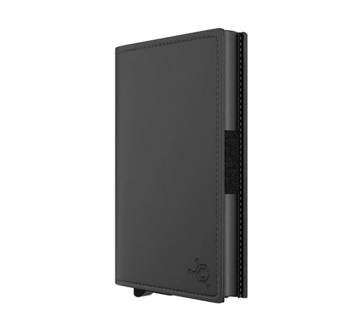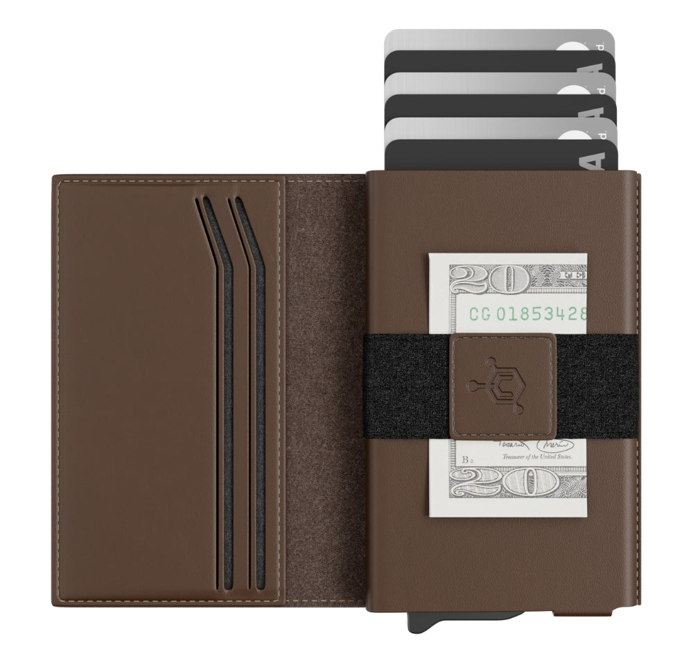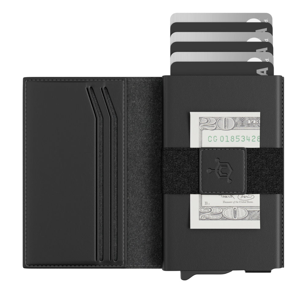A sleek RFID-blocking wallet built to streamline the way you carry cash and cards. This wallet is made from aerospace-grade aluminum and features a sliding a trigger mechanism to eject your cards instantly. Additionally, the carbon fiber cash strap firmly secures any loose cash or extra cards.