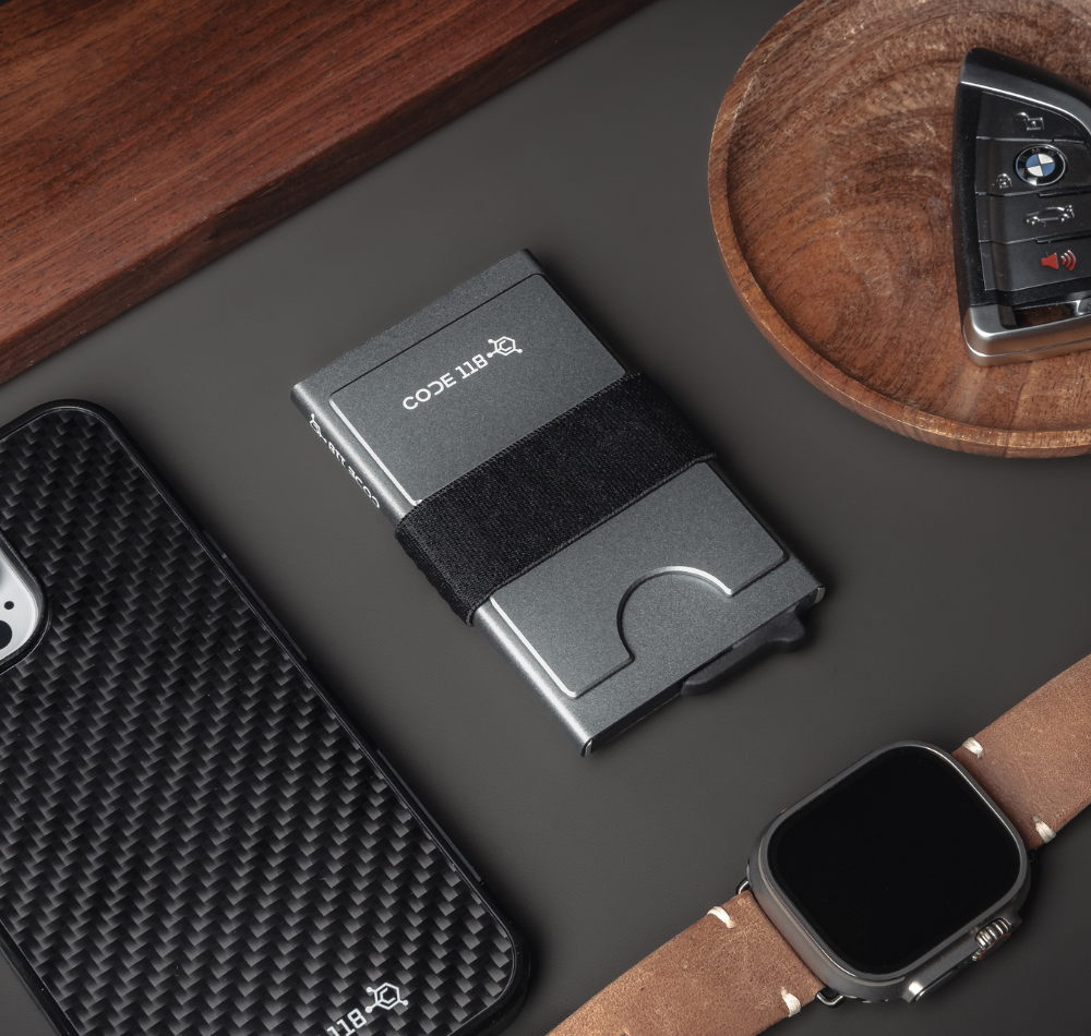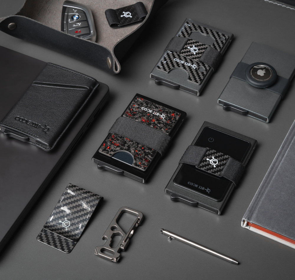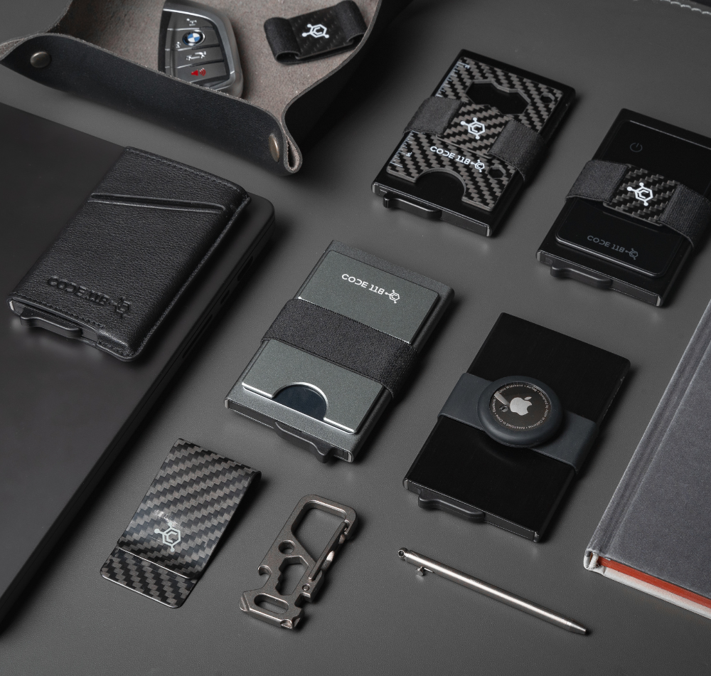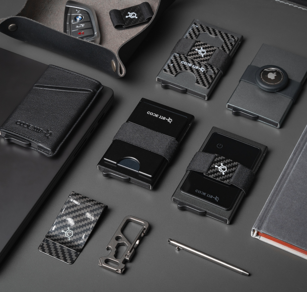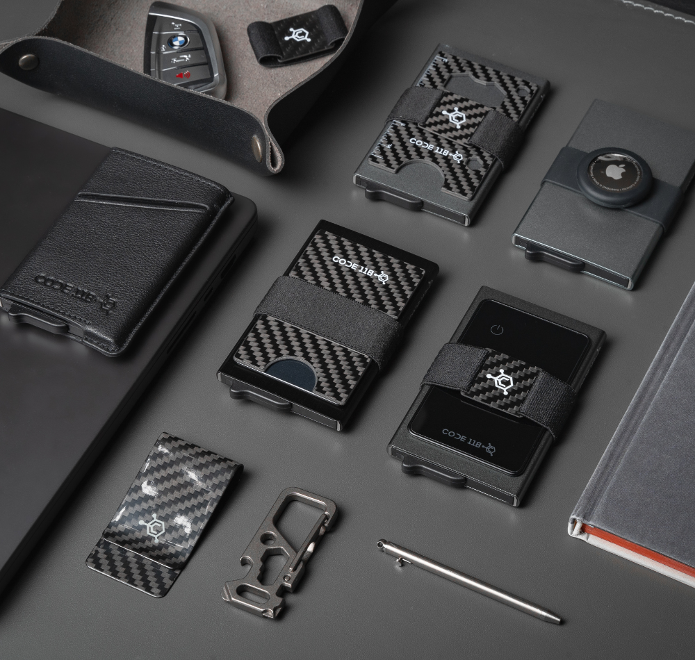 A premium leather carrying case designed for our flagship CODE 118 Wallet. Simply slide your CODE 118 Wallet into this sleek yet durable leather sleeve, and instantly expand its storage by 4 additional cards. You can also store and conceal your cash in each pocket. For anyone who wants to blend classic style with modern utility.