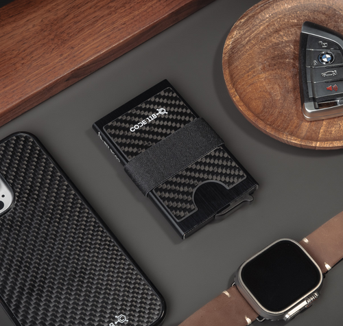 A premium carbon fiber 12-in-1 multi-tool card designed to be carried with our flagship CODE 118 Wallet. It features a ruler (in & cm), 9 wrench sizes, and a bottle opener. Compatible with all CODE 118 Wallet accessories (fits in the cash strap, modular backplate, AirTag strap, or leather case).