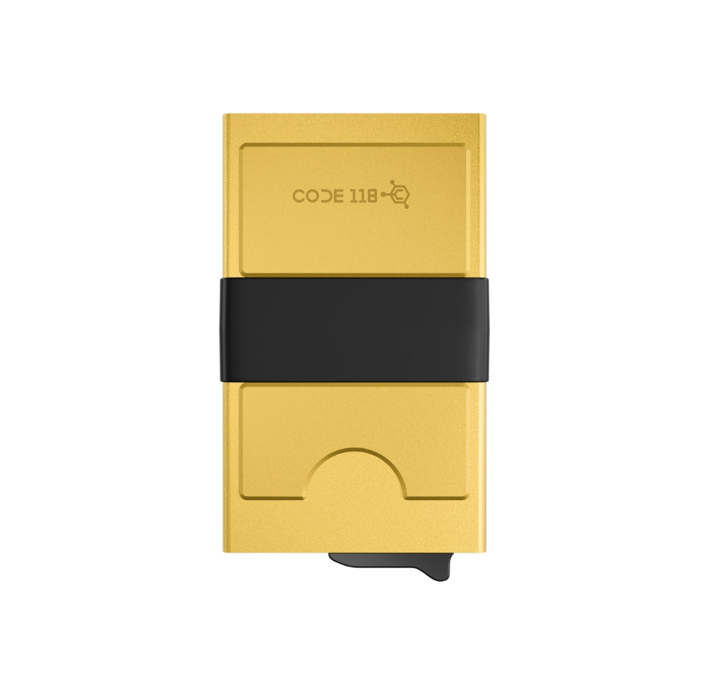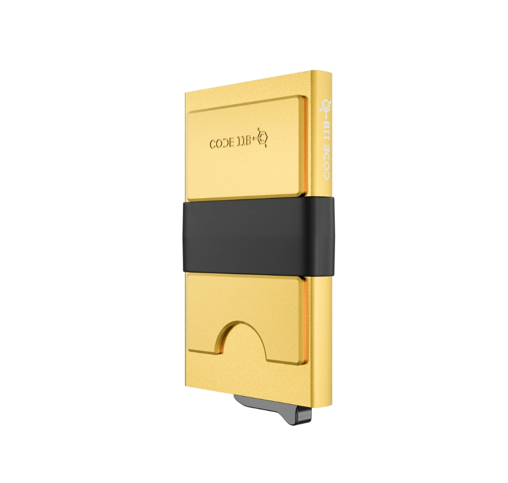 A sleek RFID-blocking wallet built to streamline the way you carry cash and cards. This wallet is made from aerospace-grade aluminum and features a sliding a trigger mechanism to eject your cards instantly. Additionally, the carbon fiber cash strap firmly secures any loose cash or extra cards.